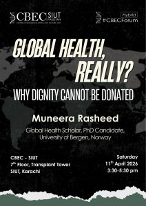Join us for an engaging CBEC Forum with Ms. Muneera Rasheed as she explores how historical, political, and ethical structures shape the discipline of global health, and how inequities built into funding, authorship, and agenda-setting affect research in the Global South. Drawing on two decades of experience, she will reflect on the evolving discourse of ‘a decolonial’ global health, the role of local voices, and the importance of centering the dignity of the community in research and practice.